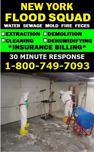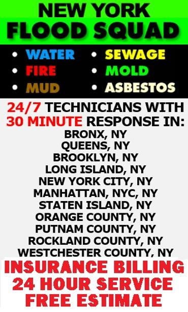 NEW YORK FLOOD SQUAD CLEAN UP SERVICE offers 24/7 30 Minute Emergency Response for flood water cleanup, sewage cleanup, mold cleanup, mud clean up, fire cleanup, smoke cleanup, asbestos clean up, feces cleanup, filth clean up and hoarding cleanup service. Our flood water damage cleaning service includes carpet water removal, basement water removal, crawlspace water removal, commercial building water removal, house water removal & sewage water removal service. We Bill Your Insurance Company for flood water damage removal & sewage water damage removal service.